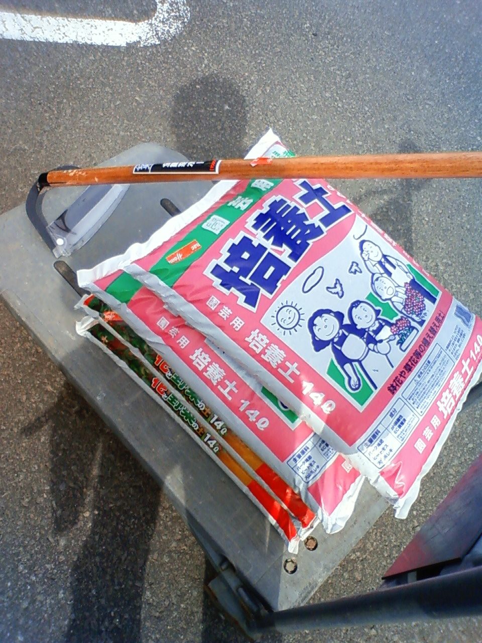 培養土いっぱい…と、鍬( ̄▽ ̄;)