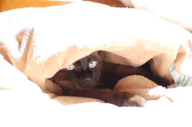 羽毛布団に潜って寝ています(;~_~)暑ソ…